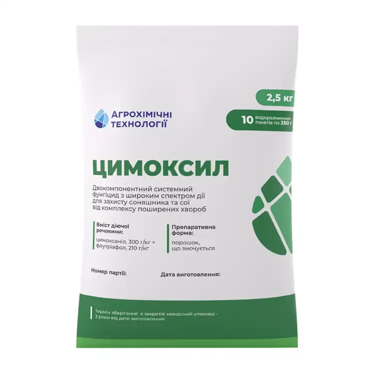 Цимоксил имеет в своем составе два действующих вещества с различными механизмами действия Цимоксанил - проникает через листья трансламинарно и локально-системно. Подавляет спороношения грибов, ингибируя биосинтез РНК в их клетках. Флутриафол - ингибирует процесс деметилирования биосинтеза стиролов, нарушая тем самым образование клеточной оболочки и развития гиф мицелия. Имеет высшую системность среди всех триазолов, движется акропетально и обеспечивает длительную защиту вновь частей растений от возбудителей болезней.