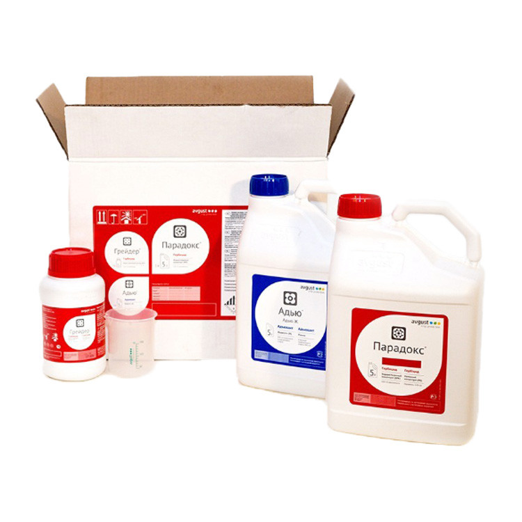 Рабочий раствор готовят непосредственно перед применением. Предварительно препараты следует взболтать в заводской упаковке. Бак опрыскивателя на 1/2 заполняют водой, в него вливают отмеренное на одну заправку количество препаратов, раствор тщательно перемешивают, в емкость доливают воду до полного объема при непрерывном перемешивании содержимого механическими мешалками. Смешивать препараты комплекта в баке опрыскивателя нужно в таком порядке: сначала - Парадокс, затем - Грейдер. ПАВ Адью добавляют в последнюю очередь, ведь пенообразование при его добавлении может вызвать выливание части раствора из бака опрыскивателя.